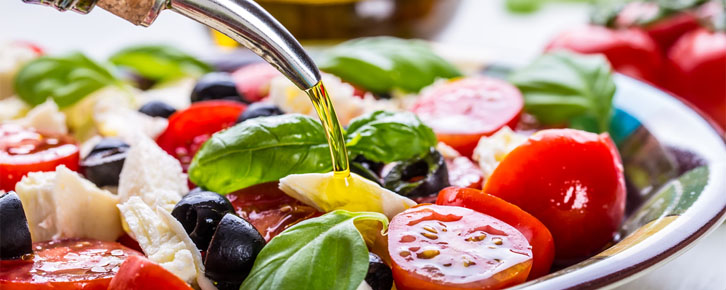 Na dieta mediterrânea, que consiste em uma maior proporção de gorduras insaturadas em relação às gorduras saturadas, ingestão moderada de álcool, alta proporção de legumes, cereais, frutas e sementes, vegetais, e maior proporção de ingestão de peixe em relação a carne vermelha, com ingestão moderada de leite e produtos derivados de leite. O uso da dieta mediterrânea pode ser comparada ao uso de uma dieta com alimentos integrais (cereais, vegetais, carnes, frutas), em contraposição aos produtos processados (carne processada, alimentos fritos, alimentos industrializados).
